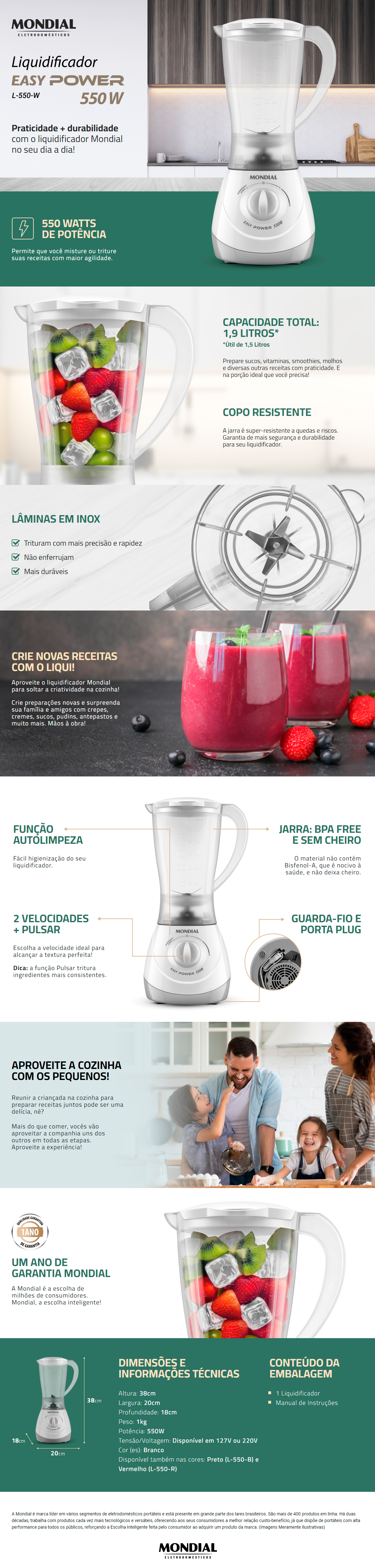 O Liquidificador Mondial Easy Power 550W é o parceiro ideal para facilitar sua rotina na cozinha. Com potência de 550W e capacidade total de 1,9 litros, ele oferece desempenho superior para misturar, triturar e preparar diversas receitas. Equipado com 2 velocidades + Função Pulsar, garante praticidade, rapidez e eficiência em qualquer preparo.