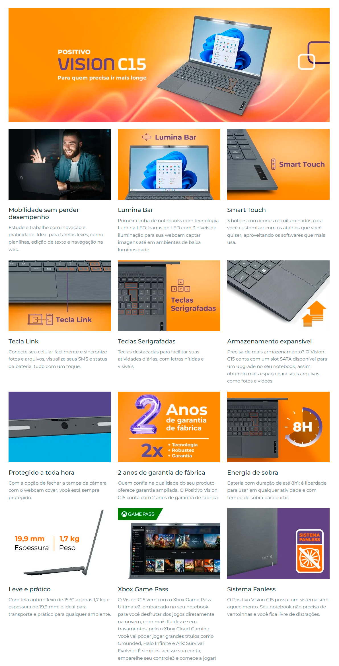 * Microsoft 365 incluso por 1 ano. Ativação é necessária dentro de 180 dias a partir da data de ativação do Windows. 1 ano de assinatura Dropbox 100GB; Anti-vírus 30 dias; modo Noturno via Screen Control Positivo.