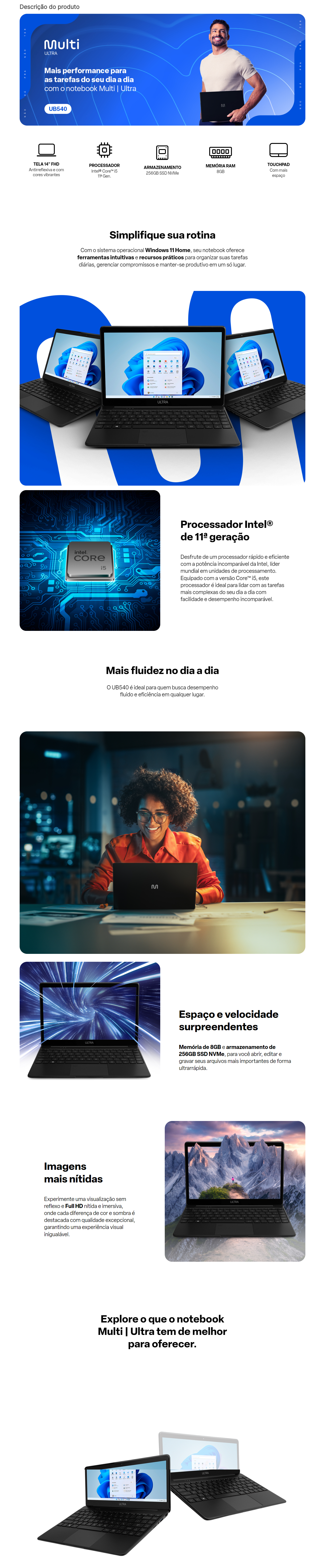 Trabalhe, estude e divirta-se com o notebook Ultra Core i5 com Windows 11 Home. Feito para facilitar a sua vida, ele é a combinação perfeita de portabilidade e desempenho para não deixar você na mão. Com o Ultra Core i5, você pode jogar os principais games do mundo em uma tela ampla. O seu parceiro no dia a dia, fácil de levar para qualquer lugar.