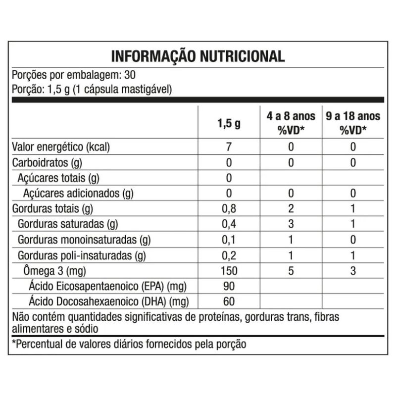 Contém 90 mg de EPA e 60 mg de DHA na porção diária;