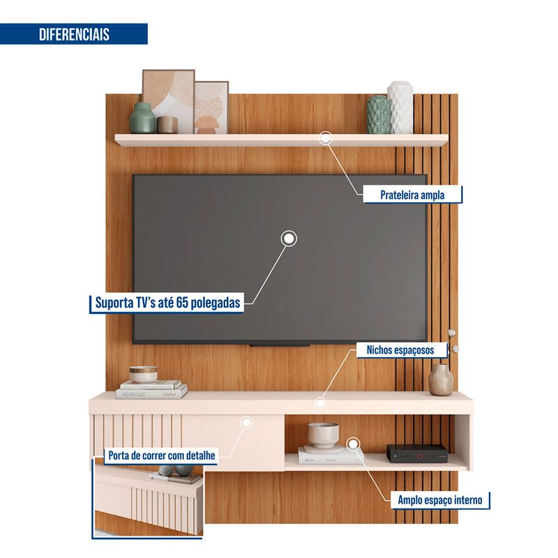 O Painel para TV Jade é a solução perfeita para quem procura um móvel elegante e funcional para otimizar o espaço da sala de estar. Com capacidade para instalar televisores de até 55 polegadas, possui 1,5 m de largura oferece um design moderno e sofisticado que combina com diversos estilos de decoração. Destaque para a lateral e porta que conta com o ripado e que agregará muito mais charme e beleza à sua decoração