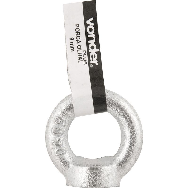 Diâmetro da rosca da porca com olhal: 16,0 mm Diâmetro da base do olhal (d1): 35,0 mm Diâmetro externo do olhal (d2): 63,0 mm Diâmetro interno do olhal (d3): 35,0 mm Espessura da base do olhal (C): 12,0 mm Espessura superior do olhal (K): 16,0 mm Espessura inferior do olhal (M): 17,0 mm Carga de trabalho da porca com olhal: 0,50 t Carga de ruptura da porca com olhal: 2,00 t Fator de segurança da porca com olhal: 4:1 Norma DIN: 582