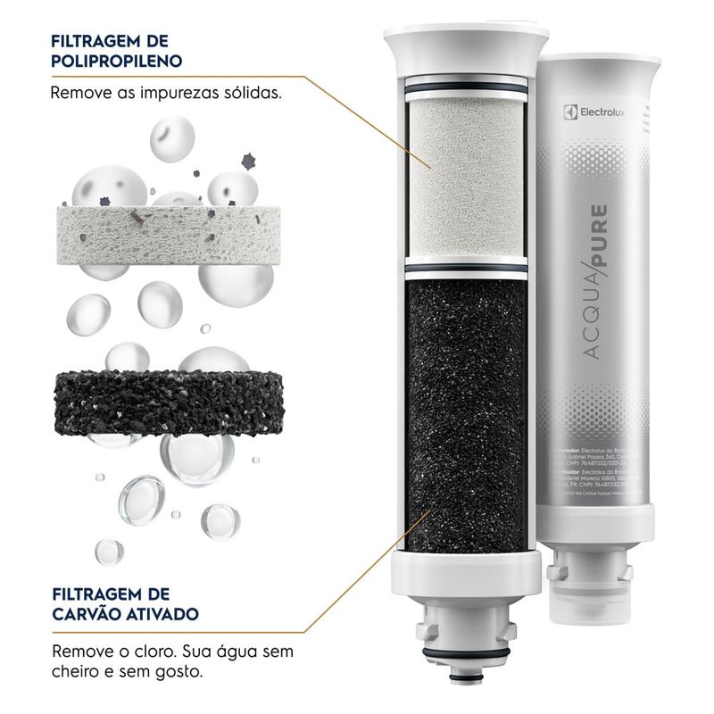 Equipado com filtro com Tecnologia Acqua Pure, reduz cloro, odores e outras partículas presentes na sua água, além de inibir o desenvolvimento de bactérias², para uma água pura e saudável.