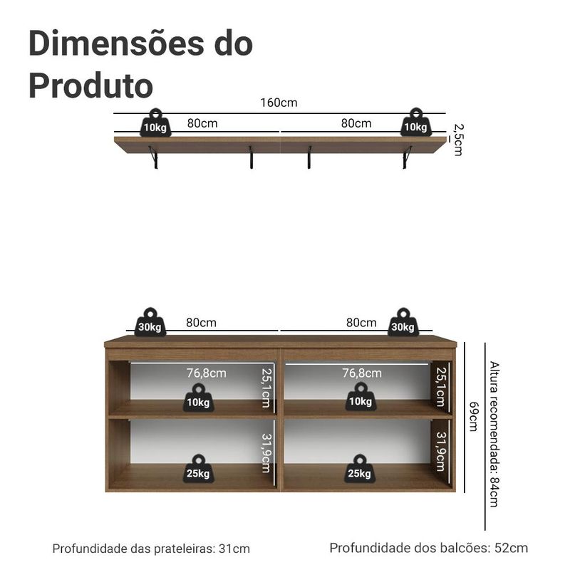 - 31 cm de profundidade nas prateleiras e 52cm nos balcões