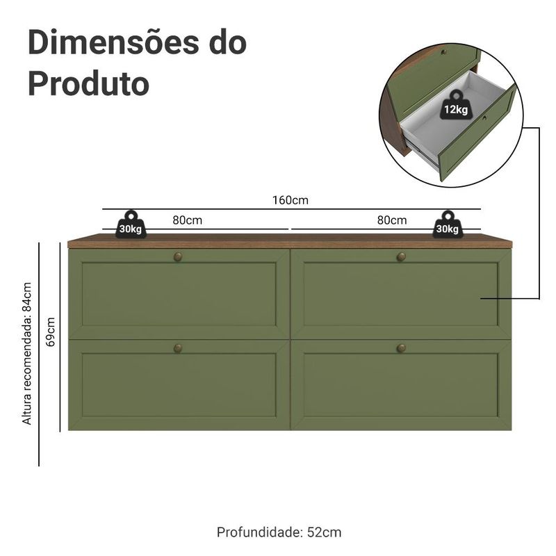O acabamento de alta resistência da estrutura é no tom amadeirado Rustic e das frentes em Verde, possuindo uma textura suave ao toque. O destaque fica por conta dos puxadores ponto em ouro envelhecido, feitos com metal resistente, trazem personalidade e um charme único. O detalhe chanfrado das frentes forma molduras delicadas e atemporais.