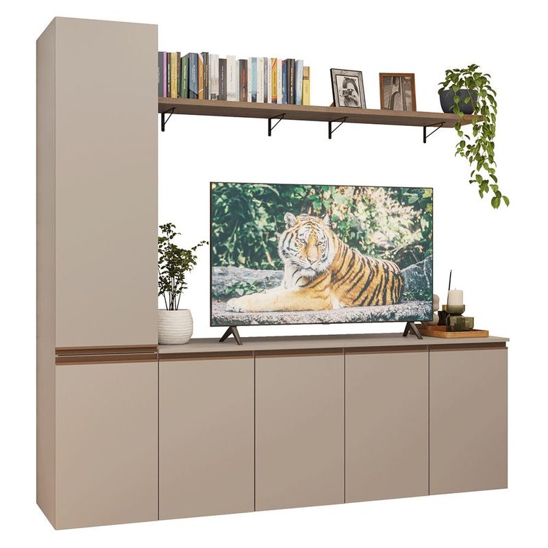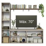 Composto por dois balcões, um armário vertical com nichos internos e duas prateleiras suspensas, o conjunto oferece espaço para TV de até 70 polegadas. Os módulos permitem organizar objetos e exibir itens decorativos, deixando a sala sempre em ordem. Além disso, é projetado para instalação suspensa, proporcionando um visual leve e contemporâneo