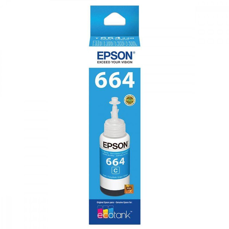 Características - Marca: Epson - Modelo: T664220 - Cor: Ciano  As tintas MicroPiezo possuem a tecnologia Epson que proporciona alta precisão no tamanho da gota, alta resolução e definição nas impressões. Você poderá imprimir documentos e imagens com ótima qualidade por um baixo custo por página. Obtenha impressões brilhantes em relatórios, gráficos e fotos.  - Especificações Técnicas: - Compatibilidade: L110 / L200 / L355 / L395. - Cor do cartucho: Ciano. - Tecnologia de impressão: Jato de tinta. - Rendimento: Aprox: 6.500 páginas. - Conteúdo: 70 ml - Ean: 010343885301  Dimensões do Produto: - 16cm x 6cm x 6cm - Peso: 150g  Conteúdo da Embalagem: - Refil de Tinta na Cor Ciano.  Garantia: - 3 meses.