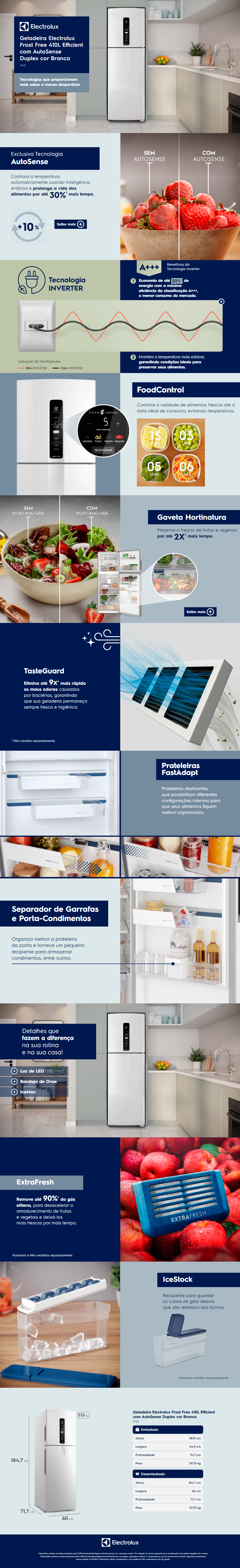 Tecnologia - Frost Free Inverter Água na Porta - Não Compartimento Congelamento Rápido - Sim Compartimento Extra Frio - Sim Degelo Automático - Sim Fábrica de Gelo Automática - Não Gelo na Porta - Não Pés Niveladores - Sim Porta Latas - Não Porta Reversível - Não Prateleiras Removiveis - Sim Rodízios - Sim Puxadores - Sim (Embutido) Trava painel de controle - Sim Tipo de Compressor - Inverter Iluminação no compartimento refrigerador - Sim Iluminação no compartimento freezer - Não Controle de Temperatura - Automático Função Turbo - Não Compartimento FlexiSpace - Não