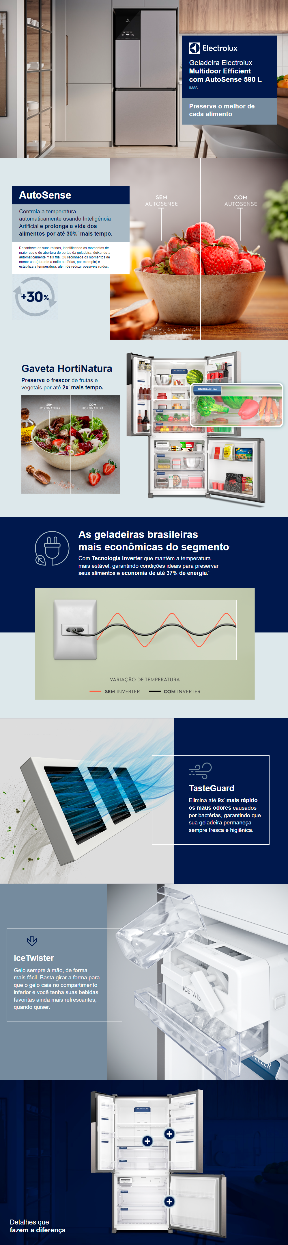 A Geladeira Electrolux Multidoor Efficient com AutoSense 590 L possui três portas para garantir mais espaço para armazenar e mais funções destinadas a manter o frescor dos alimentos por mais tempo.