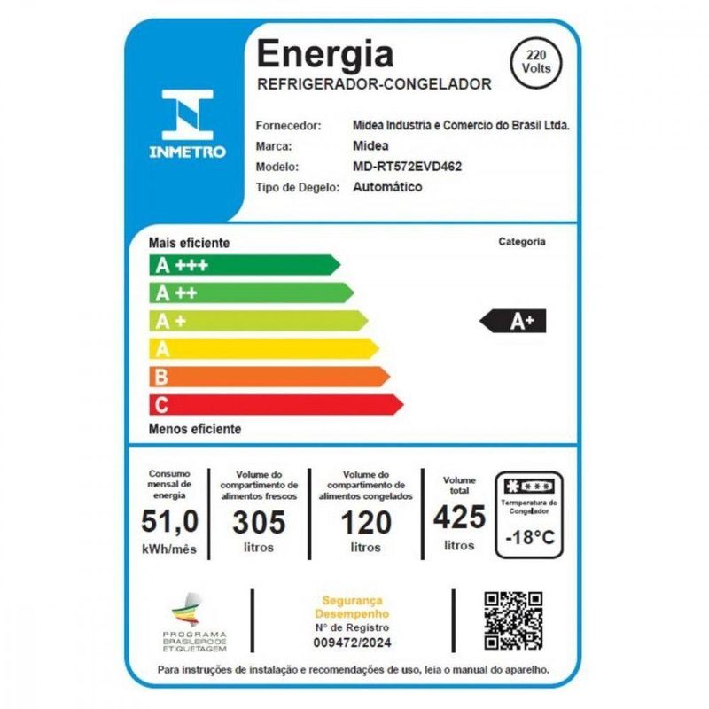 Refrigerador Midea MD-RT572EVD461 425L Inox 110VGeladeira Midea Frost Free Duplex 425L com Painel Touch - InoxA nova Geladeira Midea Frost Free Duplex de 425 litros vai te surpreender! Ela é moderna, espaçosa e conta com o maior freezer da categoria, com 120 litros de capacidade. Além de ser econômica, com classificação A+ no INMETRO, possui painel touch e um design sofisticado que vai transformar a sua cozinha.