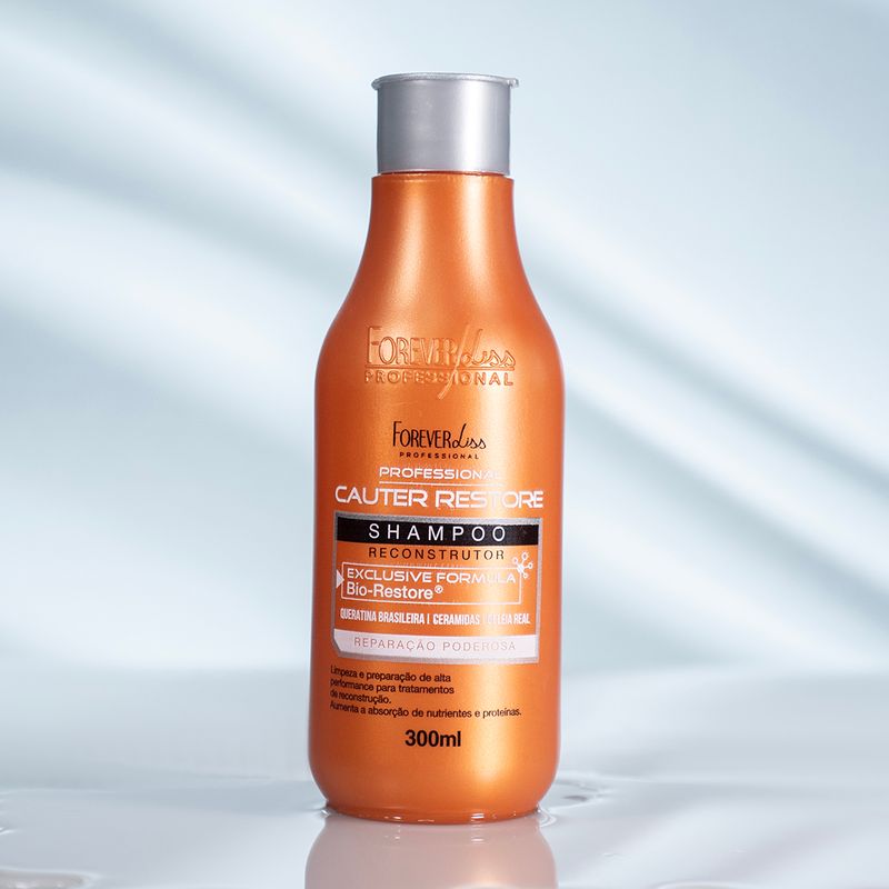Shampoo Cauterização Forever Liss 300ml para cabelos danificados e porosos. Com sua exclusiva fórmula Bio-Restore, keratina Brasileira, Ceramidas e geleia real promove limpeza suave com preparação de alta performance, removendo impurezas e reestruturando toda a fibra capilar de forma intensa em cabelos ressecados e fragilizados por química. Promove reparação poderosa enquanto fortifica os seus fios tornando-os mais resistentes a danos futuros.