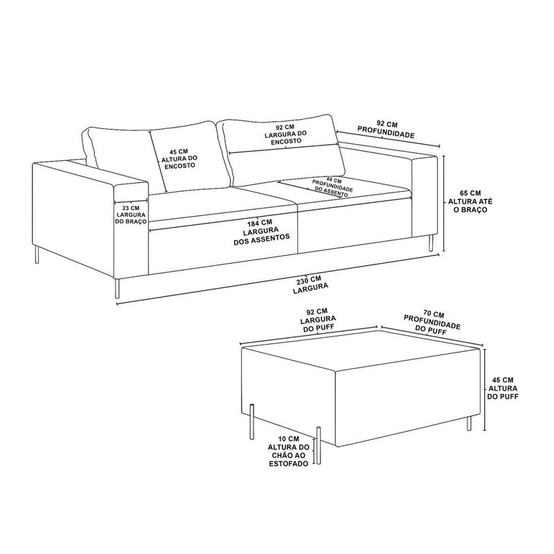 Revestido em tecido bouclê, o sofá traz um toque sofisticado e macio, combinando com ambientes modernos e aconchegantes. Seu encosto é preenchido com fibra siliconada, oferecendo suavidade e apoio confortável, enquanto o assento conta com espuma de densidade D-28, garantindo firmeza e durabilidade.A base e estrutura inferior em ferro proporcionam resistência e um visual contemporâneo. Além disso, o produto acompanha um puff, que pode ser utilizado como apoio de pés ou assento adicional, agregando versatilidade ao ambiente. Especificações do produtoTecido em BouclêEnchimento do encosto em fibra siliconadaA espuma do assento possui densidade D-28Sofá que vem na caixa juntamente do puffSua estrutura é inteira em espuma, enquanto a base inferior do produto é de ferro Informações TécnicasAltura: 80 cmLargura: 230 cmProfundidade: 92 cmPeso: 45 kg Capacidade de Suporte: Cada módulo do produto suporta até 200 kg Produto embaladoAltura: 101 cmLargura: 121 cmProfundidade: 123 cmPeso: 45 kg Observações ImportantesProduto com 3 meses de garantia contra defeitos de fabricaçãoEnvio bem embalado para garantir segurança no transporteA cor pode variar levemente de acordo com o monitor/telaEnvio em até 5 dias úteis após a confirmação do pedidoNão nos responsabilizamos pela subida de escada no ato da entrega Perguntas FrequentesComo devo limpar?Realizar a limpeza do tecido com um pano seco ou levemente umedecido Quantos produtos irei receber nesta compra?Você receberá 3 volumes, dois para o Sofá Sense Compact Air Com Base de Ferro, e o terceiro para o Puff de apoio aos pés Para mais informações ou assistência com sua compra, nossa equipe está à disposição para oferecer ajuda
