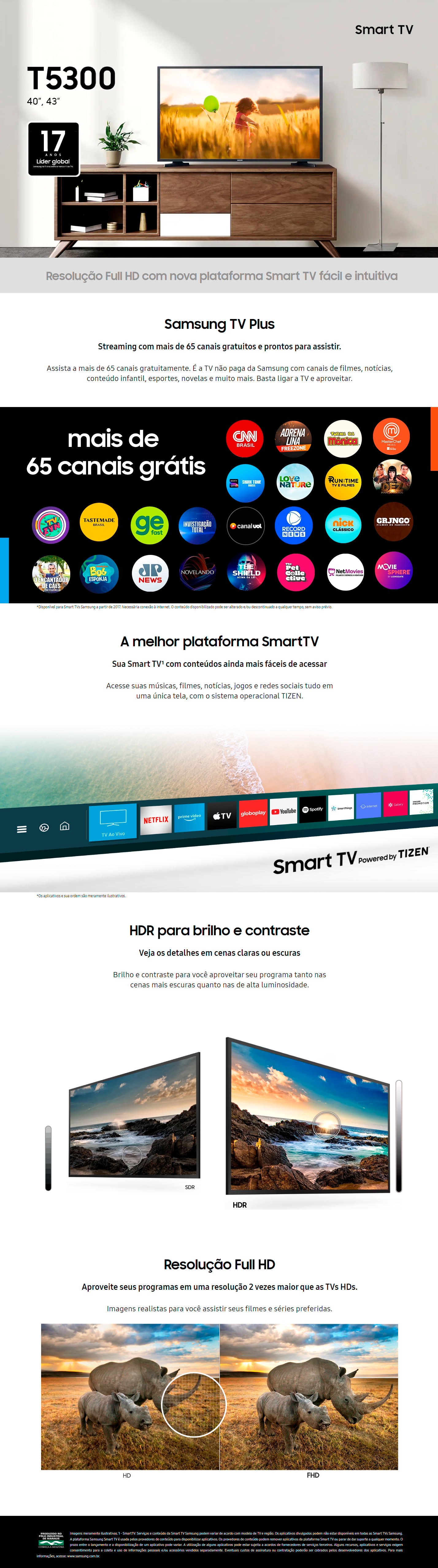 A Smart TV Samsung 43T5300 é a união perfeita entre uma imagem Full HD de alta qualidade, recursos inteligentes e a facilidade de uso do sistema Tizen, entregando um excelente custo-benefício para sua casa.