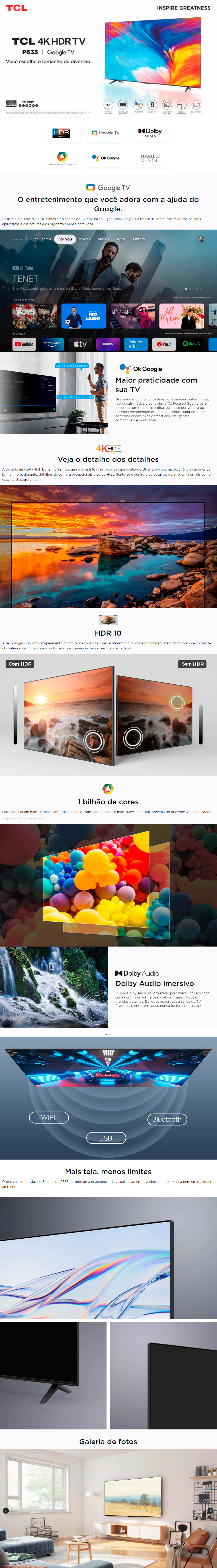 Conteúdo da embalagem: 01 TV, 01 controle remoto, 01 cabo de força, manual eletrônico e manual de instruções.