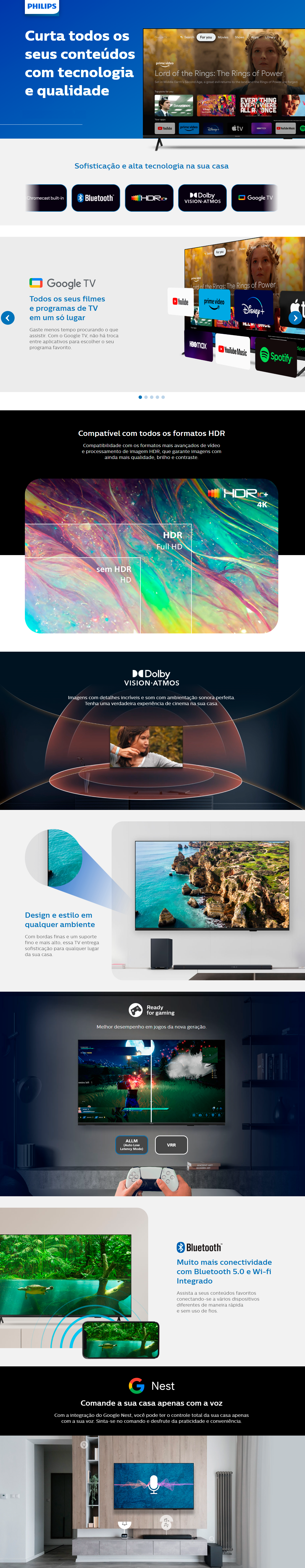 Diferencial: Plataforma Google TV, Processador Quad Core, Comando de Voz com Google Assistant, Botoes de Atalho, Netflix, Youtube, Prime Video, HDR10/HDR10+HLG, Pixel Plus Ultra HD, Dolby Atmos, Dolby Vision, Google Assistant - Equlizador de 05 bandas (som com IA), Nivelador de Volume e Reforço de Graves DOLBY).