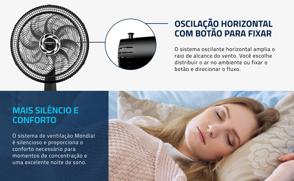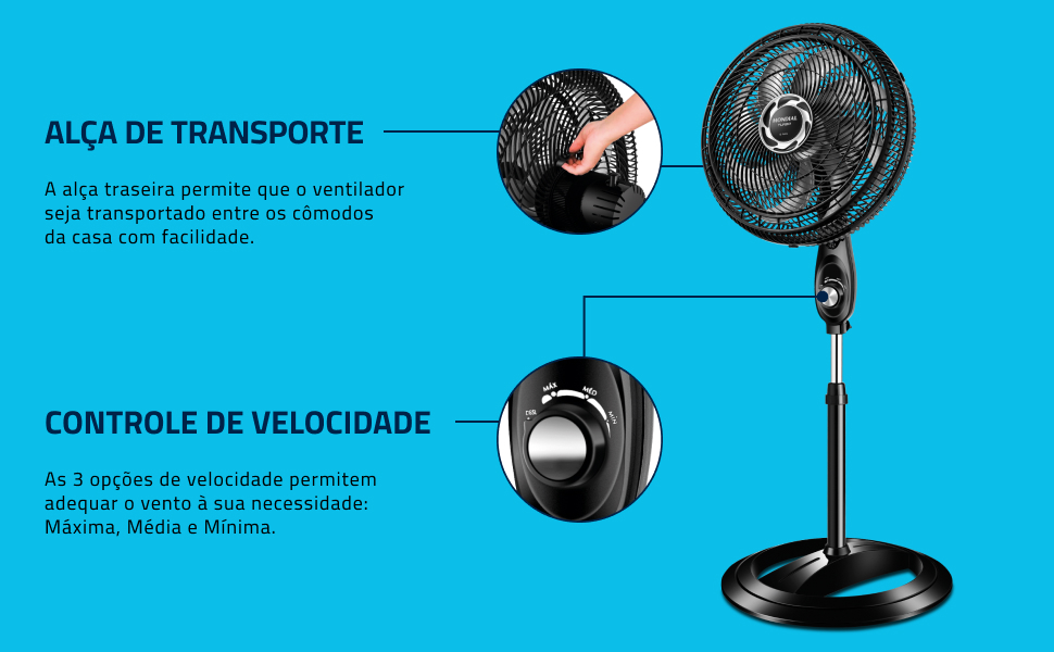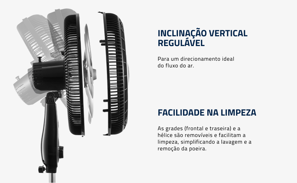 Ajuste a altura, escolha a inclinação, altere as velocidades e acione a oscilação horizontal para uma distribuição de ar mais uniforme. O ventilador possui grades removíveis para facilitar a limpeza e conta com uma alça de transporte, permitindo que você o leve facilmente para qualquer lugar.