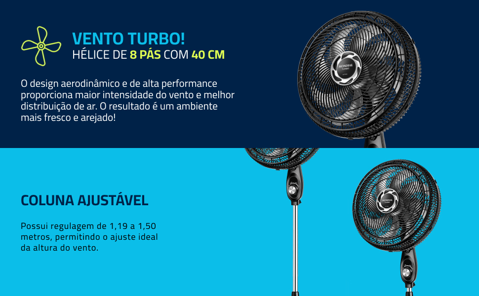 Diâmetro: 40cm, com 8 pás para maior vazão de ar